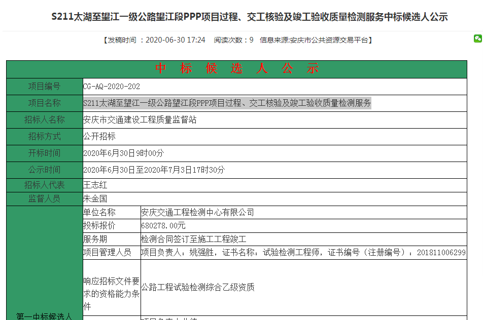 公司中标S211太湖至望江一级公路望江段PPP项目过程、交工核验及竣工验收质量检测服务项目,这是公司资质升级后中标的第一个一级公路检测项目,为公司打开一级公路检测市场奠定了坚实的基础。