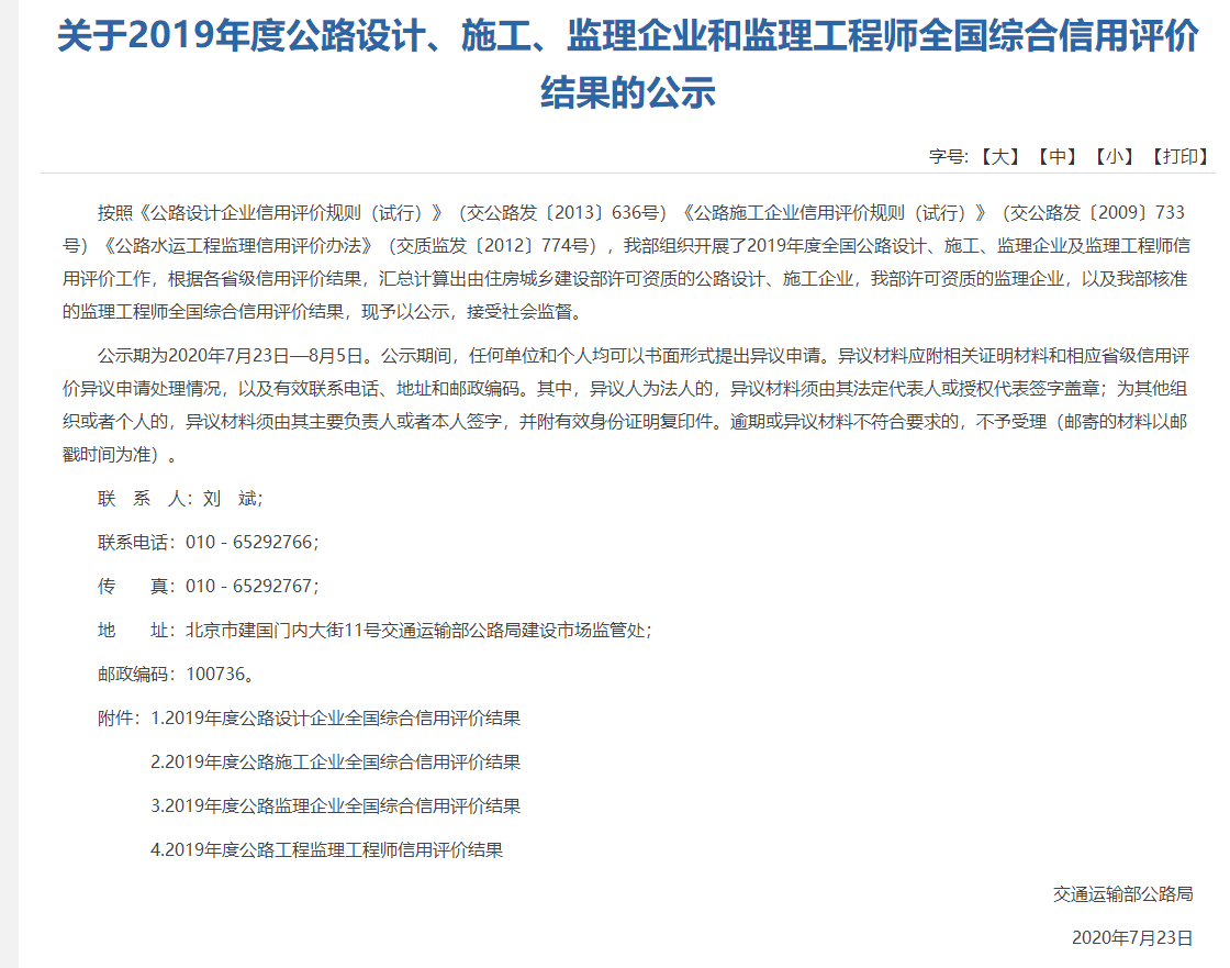 交通运输部《关于2019年度公路设计、施工、监理企业和监理工程师全国综合信用评价结果的公示》我院获得AA级