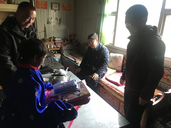 捐赠仪式结束后,在色达县委副书记桂志敬和学校老师的陪同下,王海臣一行走访了贫困学生家庭,与学生家长亲切交谈,实地了解他们的生活情况,并将书包、字典、文具等用品送到孩子手中。